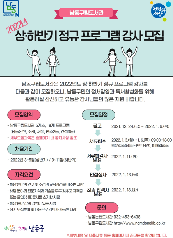 인천시 남동구는 내년 3~11월 운영하는 구립도서관 상·하반기 정규 프로그램에 함께할 강사를 공개 모집한다고 31일 밝혔다.