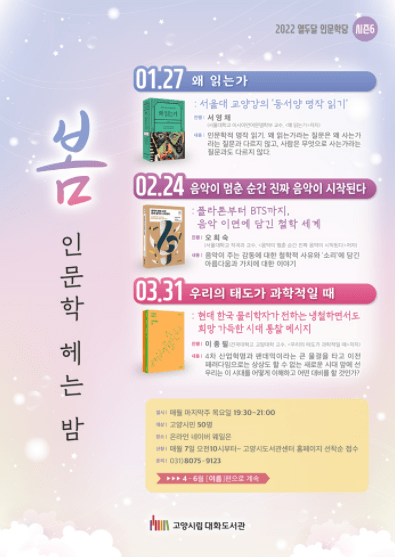 고양시 대화도서관이 2022년 시즌 6을 맞이한 ‘열두달 인문학당’ 봄편을 운영한다. 1월 27일부터 시작하는 봄편 ‘인문학 헤는 밤’은 문학, 음악 등을 주제로 총 3회 진행될 예정이다.