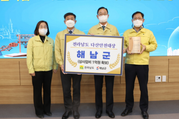 해남군은 전라남도가 주관하는 제4회 다산안전대상 평가결과 우수기관으로 선정되어 상사업비 1억원을 확보했다.