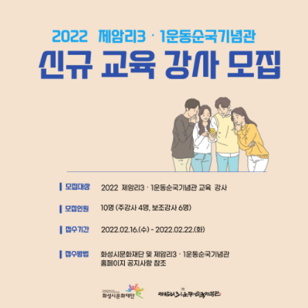 (재)화성시문화재단은 제암리3.1운동운동순국기념관 및 화성3.1운동운동만세길 교육을 이끌어갈 신규 교육 강사를 2월 16일부터 2월 22일까지 모집한다.