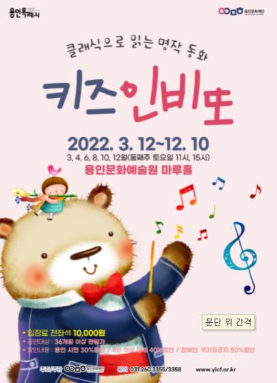 용인문화재단은 용인문화예술원 마루홀에서 2022년 키즈 인비또 ‘클래식으로 읽는 명작 동화’ 공연을 3월부터 12월까지 진행한다.