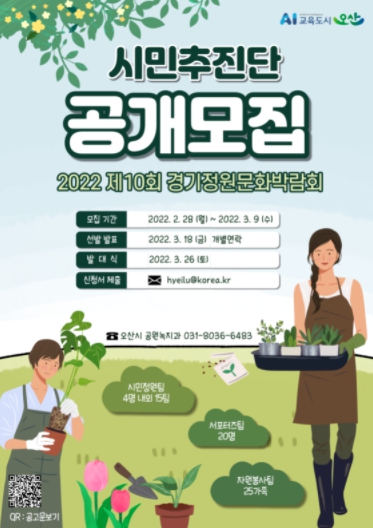 오산시는 2022 제10회 경기정원문화박람회 개최에 따라 정원문화를 체험하고 홍보활동을 함께할 시민추진단을 모집한다고 25일 밝혔다.