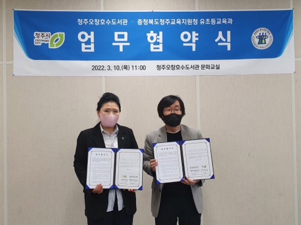 청주오창호수도서관이 10일 오창호수도서관 문화교실에서 충청북도청주교육지원청 유초등교육과와 유아· 초등의 독서문화 활성화와 독서교육을 위한 상호협력 협약을 체결했다.