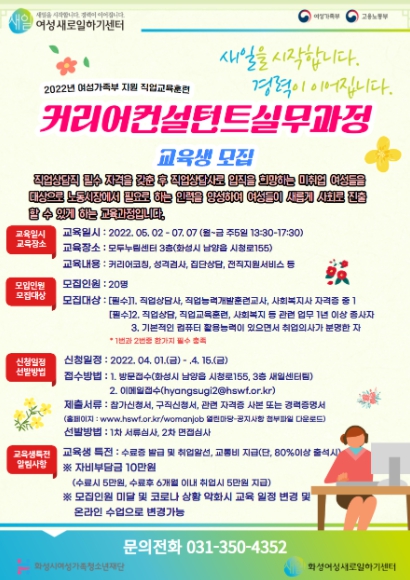 (재)화성시여성가족청소년재단(대표이사 김경륜) 화성여성새로일하기센터는 여성가족부가 지원하는 직업교육훈련의 일환인 '커리어컨설턴트실무과정'의 교육생을 2022년 4월 1일부터 4월 15일까지 모집한다.