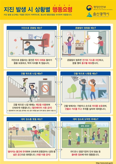 김노경 시민안전실장은 “지진을 대비한 조그만 실천이 우리 모두의 안전을 지키는 첫 걸음이다.” 며 “지진 등 재난 발생 시 시민들은 거주지와 가까운 재난 대피장소로 신속히 이동할 수 있도록 사전에 대피장소 위치와 대피요령을 숙지하는 것이 중요하다.”라고 강조했다.