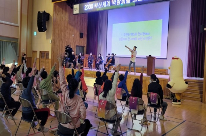 특히, 부산시립청소년교향악단과의 협업으로 생생한 연주를 직접 경험하게 하고 전문강사(EXPO GIRL)가 초등학생 눈높이에 맞추어 엑스포를 알기 쉽게 설명하여 지난 1일 첫 번째로 교육을 진행한 망미초등학교 교사와 학생들의 열렬한 호응을 받았다.
