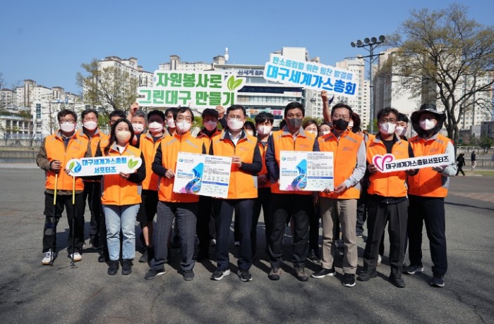 대구시설공단 임직원들이 4월 7일 신천둔치 일원에서 2022대구국제마라톤대회 개최를 기념해 쓰레기를 줍고 조깅도 하는 플로깅 캠페인을 펼쳤다.
