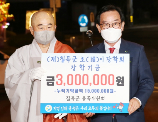 칠곡군 봉축위원회는 지나 9일 지역인재육성과 교육발전을 위해 써달라며 호이장학금 300만 원을 (재)칠곡군호이장학회(이사장 백선기)에 기탁했다.