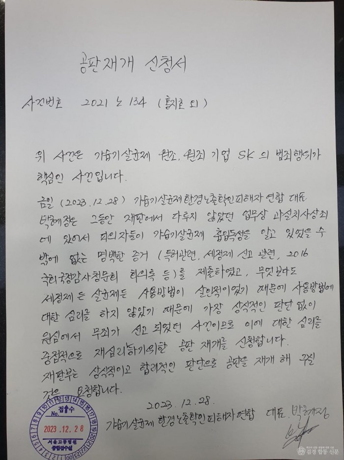 위 사건은 가습기살균제 원조, 원조 기업 SK의 범죄행위가 핵심인 사건입니다. 금일 (2023.12.28) 가습기살균제 환경노출확인 피해자 연합 대표 박혜정은 그동안 재판에서 다루지 않았던 업무상 과실치사상죄에 있어서 피의자들이 가습기살균제 흡입독성을 알고 있었을 수밖에 없는 명백한 증거들(특허관련, 세정제 신고 관련, 2016 국회 국정감사청문회 회의록 등)을 제출하였고, 무엇보다도 세정제든 살균제든 사용방법이 살인적이었기 때문에 사용방법에 대한 심리를 하지 않았기 때문에 가장 상식적인 판단 없이 원심에서 무죄가 선고되었던 사건이므로 이에 대한 심리를 중점적으로 재심리하기 위한 공판 재개를 신청합니다.
