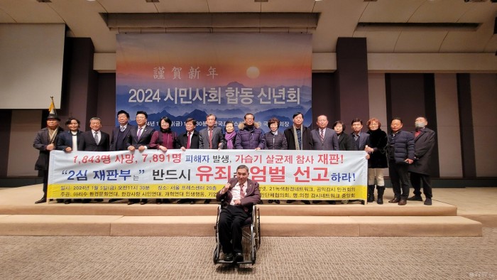 2024년 1월 5일 낮 2시쯤 광화문광장 이순신장군 동상 앞에서 가습기살균제 참사피해자들과 시민환경단체 회원들이 부실기소와 부실심리 등을 규탄하고, 공판재개와 유죄엄벌 등을 촉구하는 기자회견을 열고 있다.![]()