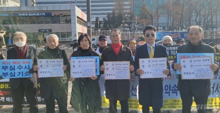 진행을 담당한 김선홍 ‘글로벌 에코넷’ 상임회장은 “검찰이 2심에서 유죄를 선고받은 13인 전원을 상대로 상고한 것이 아니라 SK 4인과 애경 3인 등 총 7인에 대해서만 상고한 것은 납득하기 어렵다”면서 질타한 뒤 기자회견 주최주관단체 대표 등과 함께 대통령집무실 관계자에게 <윤 대통령께 드리는 가습기살균제 참사 피해자와 시민사회 공동입장>(이하 국가책무이행 촉구서) 등을 전달했다.