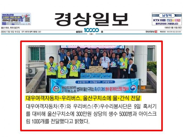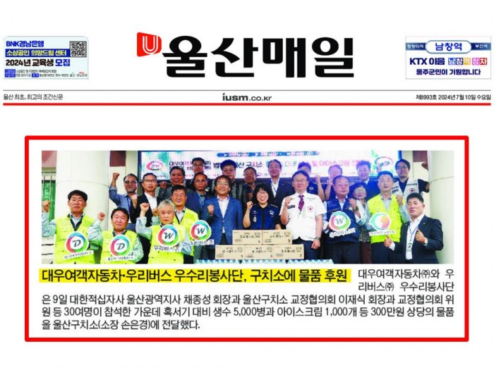 적십자 관계자는 대우여객자동차(주)와 우리버스(주)는 평소에도 울산관내 크고 작은 수많은 나눔과 배려정신으로 봉사활동을 하고 있지만 수용자를 위한 생수 및 아이스크림의 통큰 후원에 다시 한번 감사와 고마움을 전해왔다.