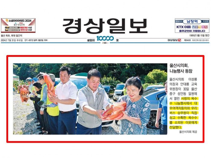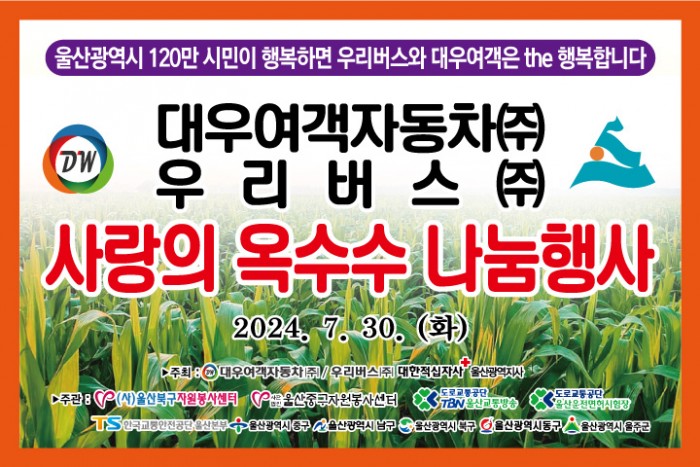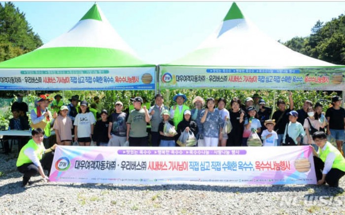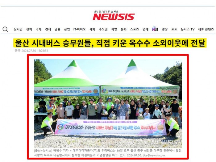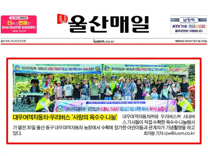 [검경합동신문 이은습 기자] 대우여객자동차(주)와 우리버스(주)우수리봉사단은 지난 3월에 시내버스 기사님들이 중구 성안동 654번지 1,800평 밭에 정성들여 직접심고 직접키운 옥수수를 직접수확하여 울산관내 중구, 남구, 북구, 동구, 울주군 ▲독거노인 및 ▲소녀, 소년 가장 ▲노인복지관 ▲교통사고피해가족돕기 ▲자원봉사센터 ▲한부모 가정 ▲중증장애인 첼린지 ▲북한이탈주민돕기 ▲지역아동센터 등 에게 ❝옥수수 10,000개 약1천만원❞