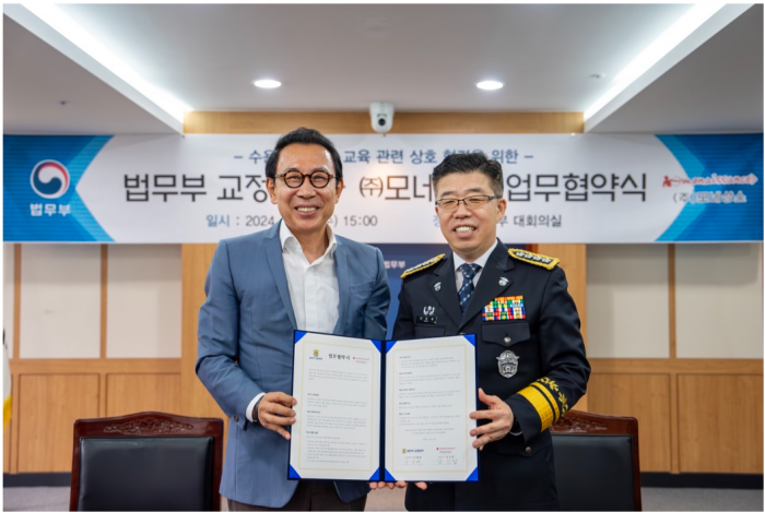 신용해 교정본부장이 7월24일 (주)모네상스와 수용자 인문학 교육을 위한 업무협약식을 체결하고 있다.