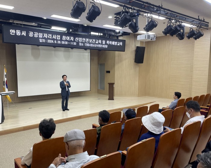 안동시는 8월 29일(목) 안동시청소년수련관에서 하반기 공공일자리사업(공공근로사업, 지역공동체일자리사업) 참여자와 지도감독 공무원 105명을 대상으로 산업안전보건교육 및 폭력예방교육을 실시했다.
