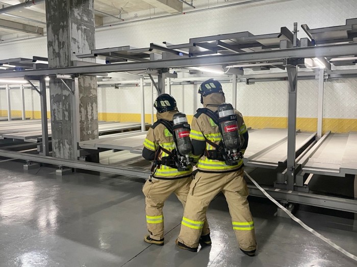 훈련은 실제 화재 상황을 가정해 ▲기계식 주차타워 화재진압 전술 숙달 ▲선착대장 현장 지휘 요령 ▲화재 발생 현황 및 화재 사례 전파 등을 실시했다.