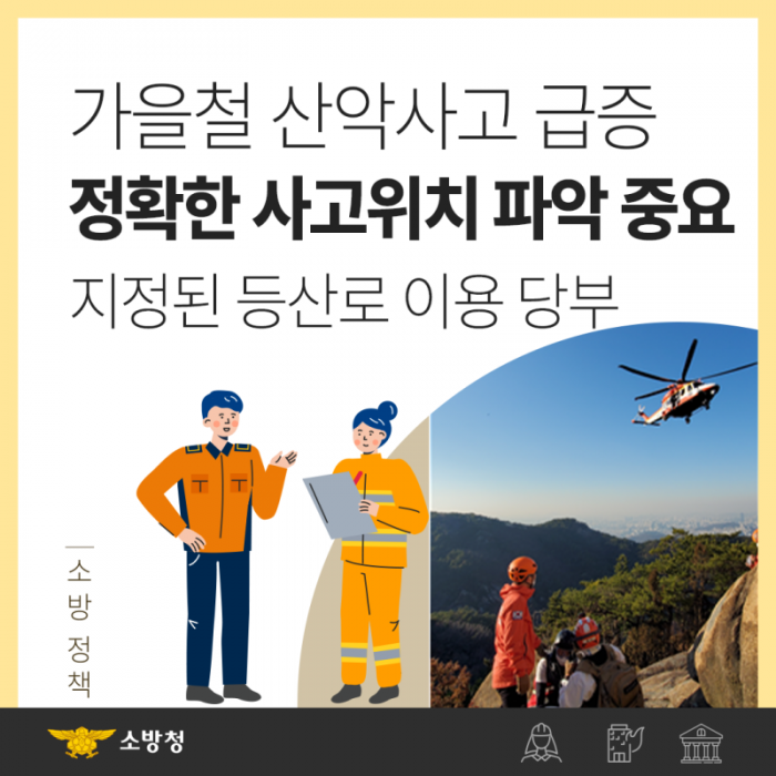 이에 따라 안전한 가을 산행을 위해 ▲산행 전 기상정보 확인 및 2인 이상 산행 ▲일몰 전 하산 ▲등산 전 가벼운 스트레칭 ▲일교차 대비 겉옷 준비 ▲지정된 등산로 활용 ▲등산로 안내판 및 산악위치 표지판 파악 등을 지켜달라고 당부했다.