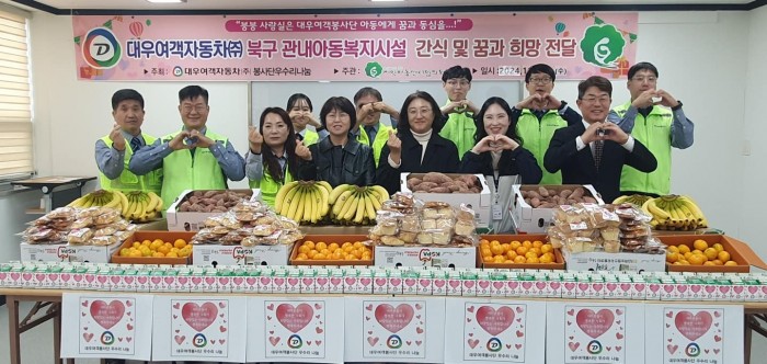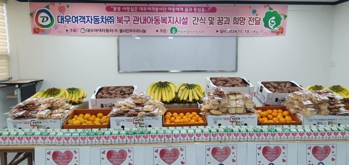 대우여객자동차(주)정종철/우수리단장은 11. 13일(수)가을철을 맞이하여 울산 북구 관내 지역아동센터 3곳에 어린이들이 좋아하는 피자, 통닭, 과자, 바나나, 빵, 음료와 농장에서 직접심고 직접기른 고구마 등 100만원 상당의 통큰 간식을 대우여객자동차(주)본사2층 교육장에서 전달했다고 밝혀왔다.
