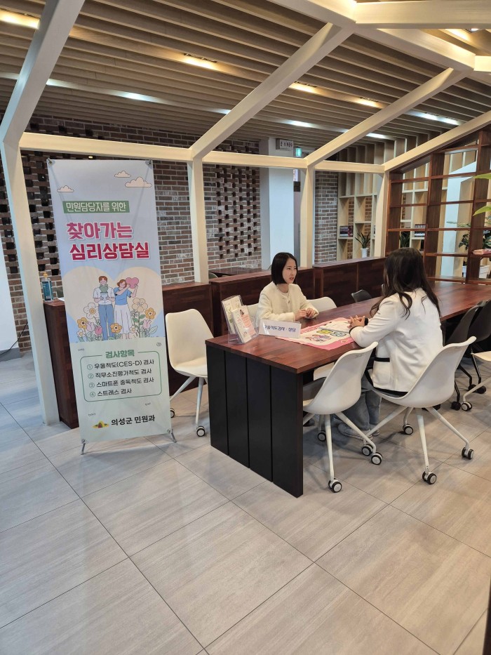 의성군청 전정 및 민원실에서 진행된 상담은 우울척도검사(CES-D), 직무소진평가척도검사 등으로 마음 건강상태를 측정하여 어려움을 점검할 수 있는 시간을 가졌다.
