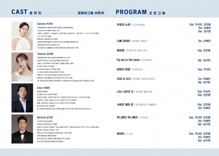 이 날 무대에서는 청년 성악가로 구성된 팝페라 그룹 ‘아르카’의 출연으로 ‘우정의 노래’로 무대를 시작하여 뮤지컬 <이순신>의 ‘나를 태워라’,<지킬 앤 하이드>의‘지금 이 순간’, <엘리자벳>의 ‘나는 나만의 것’등 뮤지컬 수록곡이 연주되고 영화음악으로는 겨울왕국에 ‘사랑의 열린 문’ 등 다채로운 음악을 들려줄 예정이다.