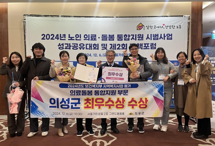 지난 6일 2024년 노인의료돌봄 통합지원 시범사업 성과공유대회 및 정책포럼에서 8개의 우수지자체가 시상된 가운데 의성군은 노인 의료돌봄분야에서 우수한 성과를 거두어 최우수 지자체로 선정되었다. 이는 대구경북 뿐만 아니라 영남권에서 유일하게 의성군이 수상하는 영예를 안았다.