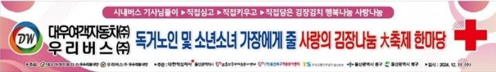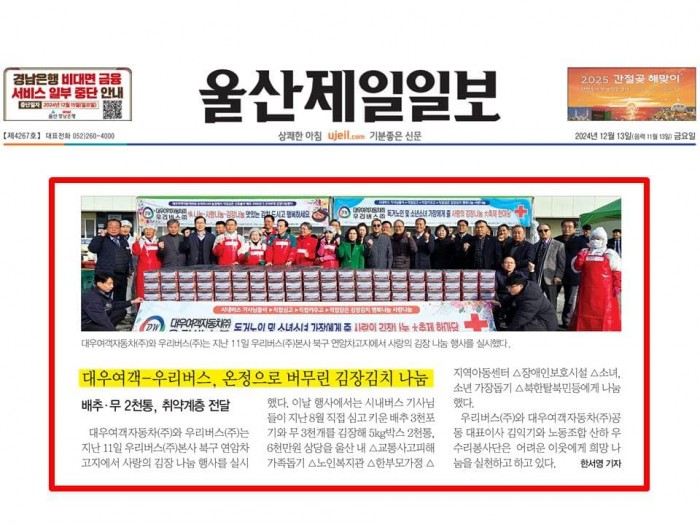 대우여객자동차(주)와 우리버스(주)우수리봉사단은 직접 재배한 배추를 직접 수확하여 직접김장해서 울산관내 ▲교통사고피해가족돕기 ▲노인복지관 ▲한부모가정 ▲지역아동센터 ▲장애인보호시설 ▲소녀, 소년 가장돕기 ▲북한탈북민등에게 5kg박스 2,000통 6천만원 상당의 지역경제 활성화를 위한 행복한 김장, 맛있는 김장, 정 나눔, 사랑 나눔, 김장 나눔, 행복 나눔 기부 행사를 하여 따뜻한 겨울나기에 사랑의 온도를 높였다.