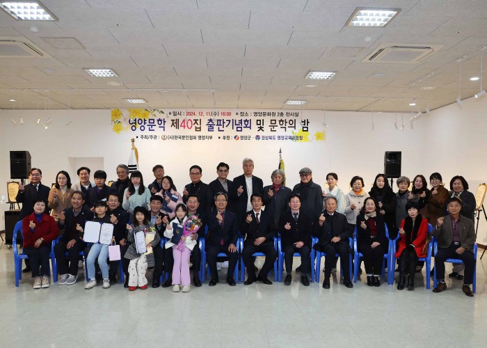 영양군(군수 오도창)에서는 (사)한국문인협회(회장 황태진) 주관으로 12월 11일(수) 오후 4시 영양문화원 2층 전시실에서 한국문인협회 회원 및 지역민들 70여 명이 참석한 가운데 영양문학 제40집 출판기념회 및 문학의 밤 행사가 개최되었다.