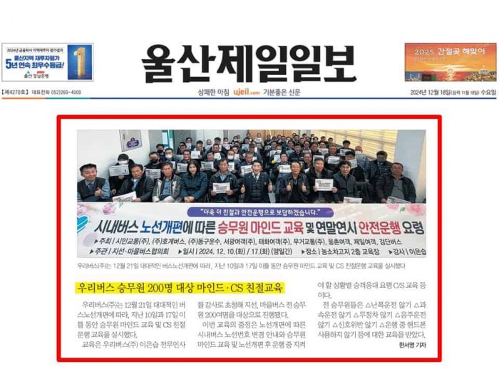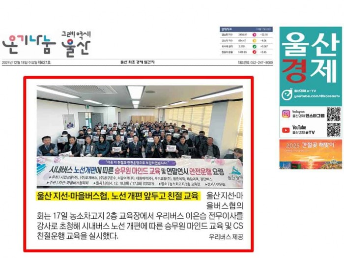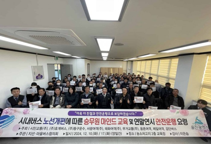 [검경합동신문 이은습 기자] 울산광역시 시내버스 12월 21일부 전면 노선개편에 따른 지선, 마을버스 전 승무원은 12월 10일, 17일 양일간에 걸쳐 우리버스(주) 전무이사 이은습 강사를 초청하여 시내버스 노선개편에 따른 승무원 마인드 교육 및 C/S 친절운행 요령을 농소차고지 2층 교육장에서 실시했다고 밝혀 왔다.