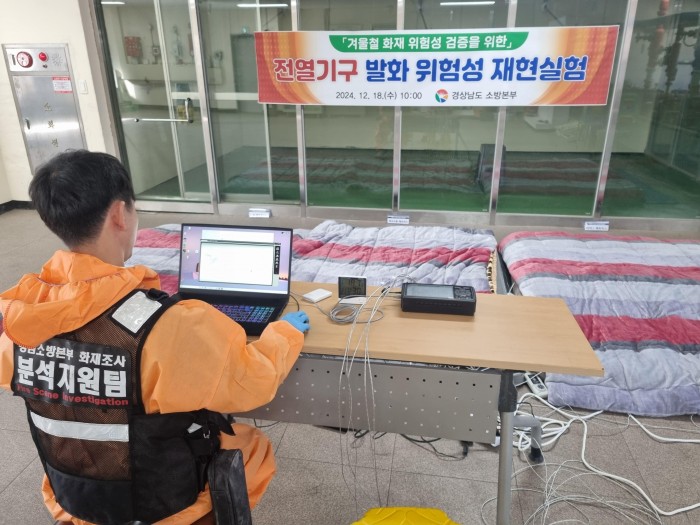 경상남도 소방본부(본부장 김재병)는 18일 경남소방교육훈련장에서 전기매트류 관련된 라텍스 소재 침구의 축열 발화 메커니즘을 검증하기 위한 화재 재현