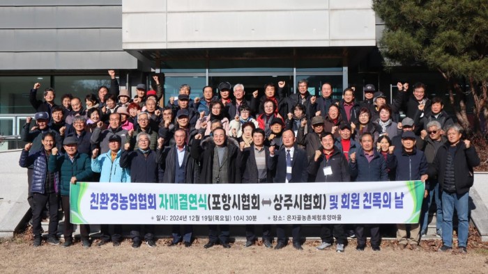상주시 친환경농업협회(회장 김회수)와 포항시 친환경농업협회(회장 권대혁)는 은자골 농촌체험휴양마을에서 12월 19일 각 단체 회원과 주요 내빈 150여 명이 참석한 가운데 상호 교류를 통해 지역 친환경농업의 상생발전을 위한 자매결연식을 개최했다.