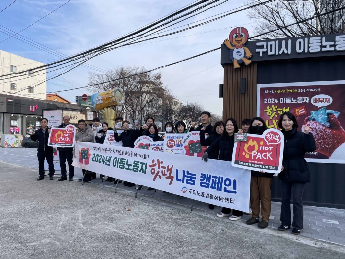 구미시는 지난 20일 구미노동법률상담센터 주관으로 이동노동자들의 겨울철 한파 대비를 위한 ‘이동노동자 핫팩 나눔 캠페인’을 진행했다. 이번 캠페인은 지난여름 실시한 생수 나눔 캠페인에 이어 노동자들의 복지를 위한 두 번째 행사로 마련됐다.