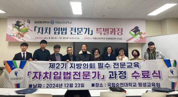 이번 과정은 전남 지역에서는 순천대에서 처음으로 운영된 프로그램으로, 전국적으로는 2기 과정이 여러 대학에서 동시에 진행되었다. 총 17주 동안 진행된 이번 교육은 지방의회 활동에 필요한 전문성을 강화하고 지방자치 발전에 이바지할 인재 양성을 목표로 했다. 특히, 수료생 11명 전원이 자치입법 전문가 1·2급(발급처: 제윤의정) 자격을 취득하는 성과를 달성했다.