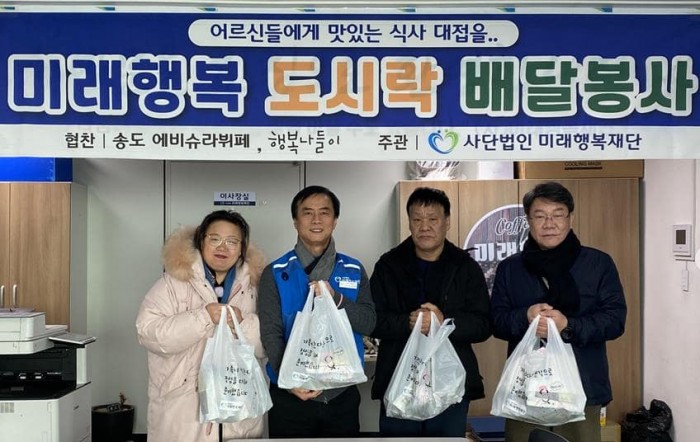 (사) 미래행복재단 이강호이사장은 2024년도 마지막 도시락배달을 송도에비슈라의 이민호대표, 석바위시장 유진이네국집, 간석동 싱싱생고기백화점 김건영대표의 후원으로, 자원봉사자들이 영하의 추운날씨에도 취약계층 가정에 정성스런 도시락을 남동구 30가구, 미추홀구 20가구, 연수구 20가구, 총 70가구에 배달하였다.