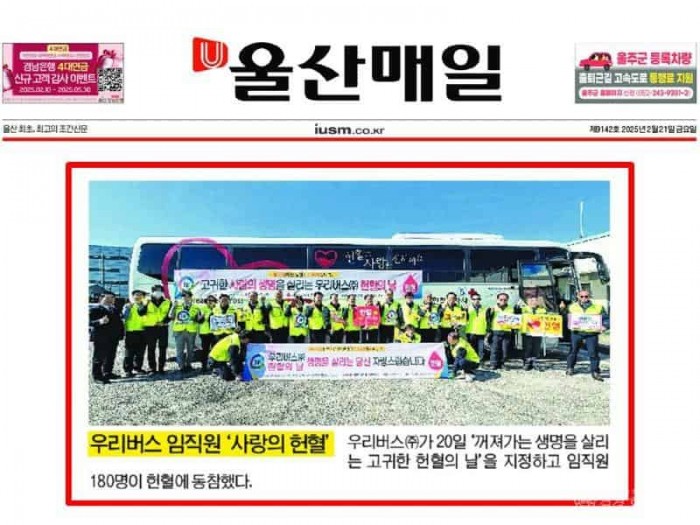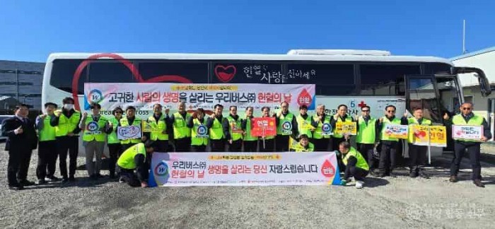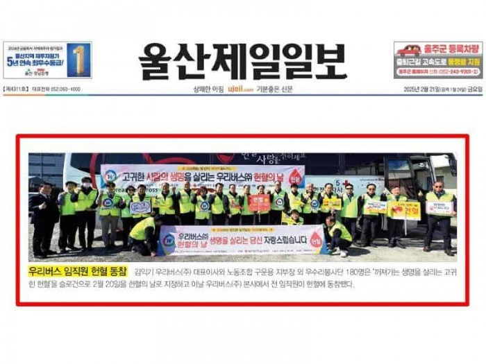 최근들어 헌혈 수급에 비상이 걸렸다는 TV보도 뉴스를 접하고 우리버스(주)대표이사 김익기와 노동조합 구운용 지부장은 대의원 대회를 통해 긴급 비상 회의를 실시한 결과 우리버스(주) 전 임,직원 180여명은 헌혈에 동참 하겠다는 뜻을 밝혀 대한적십자 울산혈액원에 이 같은 사실을 전달했다.