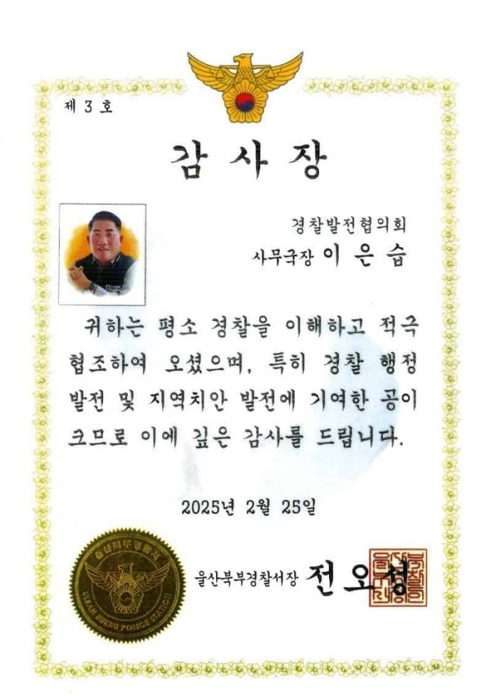 우리버스(주)이은습 전무이사는 평소 경찰을 이해하고 적극 협조하여 왔으며 특히 경찰 행정 발전 및 지역치안 발전에 기여한 공이 크므로 이에 깊은 감사장을 2. 25일(화) 북부경찰서 2층 대회의실에서 수여했다고 밝혀왔다.