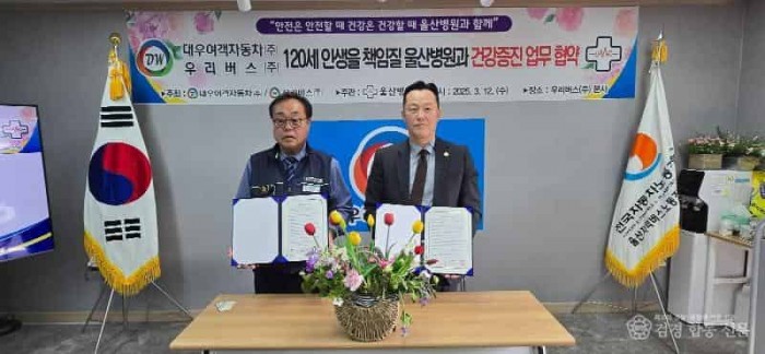 [검경합동신문 이은습 기자] 대우여객자동차(주)&우리버스(주)대표이사 김익기, 박재권은 남구 월평로에 위치한 의료법인 혜명심의료재단 울산병원 이주송 병원장은 3. 12일(수)우리버스 본사 연암차고지에서 시내버스승무원들의 건강과 복지증진 향상을 위한 의료협력 협약 MOU를 체결했다고 밝혀왔다.