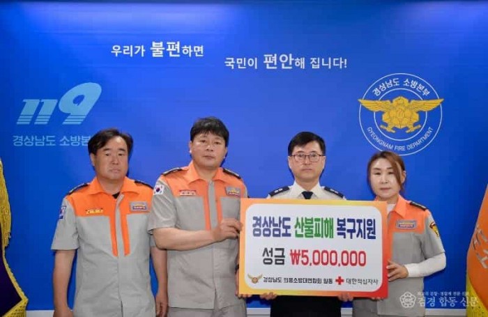 경상남도 소방본부(본부장 이동원)은 12일 오전 11시 경남도청 소방본부장 집무실에서 경상남도 의용소방대연합회(남성회장 강덕순, 여성회장 이도희)가 산불 피해 이재민 지원을 위한 성금 500만 원을 전달했다고 밝혔다.