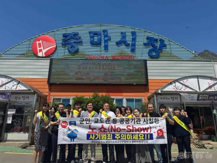 [검경합동신문 염진학 기자] 광양경찰서(서장 송기주)는 지난 65일 광양시 소상공인연합회(회장 황대환),중마지구대와 함께 중마시장을 방문하여 요즘 소상공인들을 울리며 사회적 문제로 떠오른 예약사기 즉 노쇼(No-Show) 예방 홍보활동을 하였다.