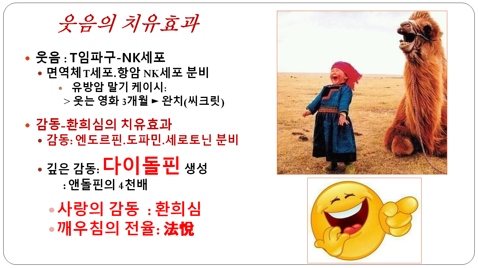 단순한 웃음이 몸을 이완시키는 단계라면, 더 깊은 단계에는 감동과 환희심이 있다.