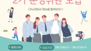 청소년 자치기구 '누리다' 2기 모집인천광역시교육청중앙도서관(관장 김용석) 소속 청소년문화공간 '다누리'는 청소년들이 주체가 되어 다양한 활동을 직접 기획하고, 의사결정에 참여하는 청소년 자치기구 '누리다' 2기 운영위원을 모집한다고 17일 밝혔다. 주요 활동은 ▲휴먼북 인터뷰 및 영상제작 ▲메이커 프로그램 기획·홍보 ▲캠프 참가 및 플리마켓 운영 ▲북 콘서트 기획·운영 ▲진로교육센터와 함께하는 웹진 참여 등이다. 모집기간은 30일까지로 인천시 관내 중·고등학생 중에서 기획/영상제작/홍보 분야에 관심 있는 청소년이라면 누구...