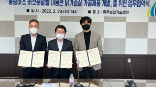 ‘동충하초 버섯분말 이용한 닭가슴살 가공제품 개발’제조기술 협약파주시는 지난 29일 농업기술센터에서 관내 농업회사법인 ㈜수지스링크 및 ㈜머쉬드림과 ’동충하초 버섯분말을 이용한 닭가슴살 가공제품 개발‘을 위한 업무협약을 체결했다고 밝혔다. 협약의 주요 내용은 ▲파주장단콩 배지를 이용한 밀리타리스 동충하초 버섯을 첨가한 닭가슴살 가공제품 공동개발 ▲지역 농식품 브랜드 창출을 위한 홍보 및 마케팅 ▲지역 농업 부가가치 향상 등이다. 최근 건강과 다이어트를 중요하게 여기는 소비트렌드로 닭가슴살 가공제품 시장은 530억원2021닐슨코리아...