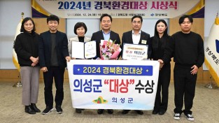 의성군(군수 김주수)은 지난 24일 경상북도 주관 ‘2024년 경북환경대상’에서 대상을 수상했다. 이번 평가에서 군은 탄소중립 생활실천 분야 300점 만점 환경관리 실태평가 분야 230점(250점 만점) 세계물의날 기관평가 분야 250점 만점 정부합동평가 분야 200점 만점 총 980점(1,000점 만점)으로 1차 평가에서 1위를 견인하였고, 2차 정성평가에서 환경관리 우수사례 발표 후 최종 대상으로 선정되었다. 의성군은 ‘탄소중립 생활실천’ 공공부문 온실가스목표관리제 이행 실적 목표를 달성하고 환경부의 기후위기 적응대...