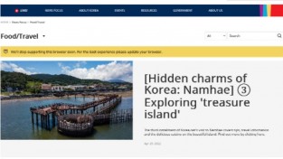 남해의 숨은 매력 전세계에 알린다!남해군 관광문화재단은 지난 달 29일 문체부 산하 해외문화홍보원의 해외홍보채널인 코리아넷 사이트에 “Hidden Charms of Korea” 란 주제로 남해군이 소개됐다고 밝혔다. 코리아넷 기자단은 지난 달 12일부터 14일까지 2박 3일간의 일정으로 남해를 방문하여 숨겨진 명소와 유명한 명소 중에서도 특별한 스토리가 있는 곳을 찾아 취재를 한 바 있다. 이번 취재는 남해군 관광문화재단 양창우 경영지원팀장이 글로벌마케팅을 위하여 제작한 다국어 관광홍보책자 ‘지금 여기愛, 남해’를 재외 한국...
