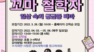 청주서원도서관, 상반기 ‘꼬마 철학자’ 운영청주서원도서관은 오는 4월 3일부터 5월 8일까지 매주 일요일 총 6회, 특화 주제인 ‘철학’ 프로그램을 온라인으로 진행한다. 상반기 ‘꼬마 철학자’는 초등학교 3~4학년 15명을 대상으로 신인실(독서지도사) 강사가 오후 1시부터 3시까지 수업을 진행한다. ‘꼬마 철학자’는 일상 속에서의 철학적 궁금증을 철학자들의 사상과 연결해 수준 높은 사고를 목표로 한다. 첫 강의일의 도서는 '멋쟁이 까마귀'이며, ‘소크라테스와 만나는 시간’을 주제로 ‘나의 참모습은 무엇일까?’에 대한 강의가 이...