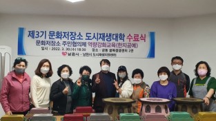 남원시, 문화저장 도시재생대학 주민협의체 역량강화교육 \"한지공예\"수료식남원시는 3월 30일 남원시 문화저장 도시재생대학 주민협의체 역량강화교육 "한지공예" 수료식을 금동골목생생센터 2관(금하정2길95-10)에서 진행했다고 밝혔다. 3기째 진행된 주민협의체 역량강화 교육은 (구)미도탕 문화저장소 리뉴얼 사업의 일환으로써 2020년 선정된 도시재생뉴딜 인정사업이다. 이번 교육은 대한민국 황실공예 지평선 대전 특선 외 다수의 수상경력을 보유한 강사를 초빙해 진행함으로써 교육과정에 참여한 주민협의체 위원들은 한지에 관한 깊이 있는...
