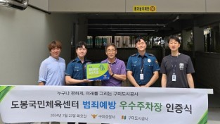 구미도시공사에서 운영하는 공영주차장 2개소와 도봉국민체육센터는 7월 23일 “범죄 예방 우수시설 인증”을 획득하고, 구미경찰서로부터 인증패를 전달 받았다. 범죄 예방 우수시설 인증은 시민들이 일상적으로 사용하는 시설에 대해 관할 경찰서가 범죄 예방 진단을 시행하고 우수시설에 대해 인증하는 제도이며, 주차장의 경우 ▲통합관제센터 운영 ▲사건·사고 기록 유지 등 91개 항목에 대한 평가를 거쳐 우수시설로 인증하고 있다. 이번에 인증을 받은 시설은 ▲구미역 후면광장 지하주차장 ▲금오천 공영주...