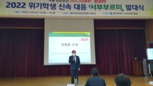 학교 안전사고 24시 긴급출동! 부르미(박주정 교육장)광주서부교육지원청이 23일 대회의실에서 학교폭력 및 위기학생에 대한 신속 대응 및 지원 확대를 위한 ‘2022 서부부르미’ 발대식을 개최했다. 23일 시교육청에 따르면 ‘서부부르미’는 초·중등 각 1팀으로 구성되며, 김효중 교장(주월중)을 단장으로 초등 팀장 오주봉 교장(평동초), 중등 팀장 양동안 교감(고실중)을 위촉했다. 또 학생생활지도 관련 학교현장 경험이 풍부한 교원 및 변호사, 전문상담교사, 상담사 등 총 30명을 컨설팅 위원으로 위촉해 본격적인 활동을 시작할 예정...